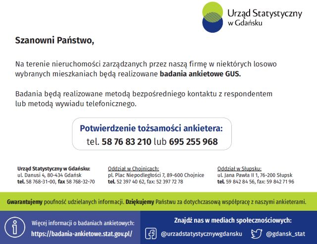 Na prośbę Urzędu Statystycznego w Gdańsku publikujemy komunikat o badaniach ankietowych.