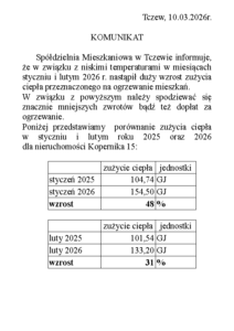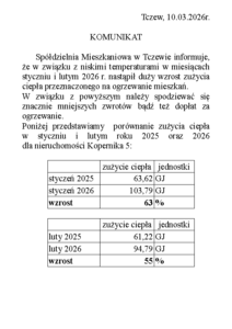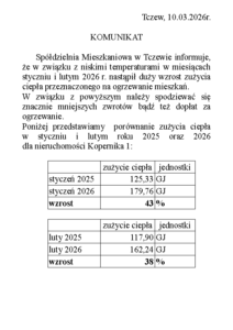 W związku z niskimi temperaturami w miesiącach styczniu i lutym 2026 r. nastąpił znaczny wzrost zużycia ciepła przeznaczonego na ogrzewanie lokali. Prosimy zwrócić uwagę, że w rozliczeniu rocznym kosztów centralnego ogrzewania obejmującym te miesiące, należy spodziewać się znacznie mniejszych zwrotów bądź też dopłat za ogrzewanie.