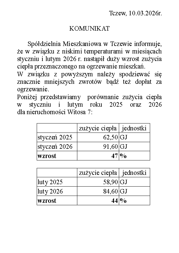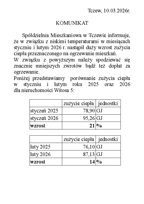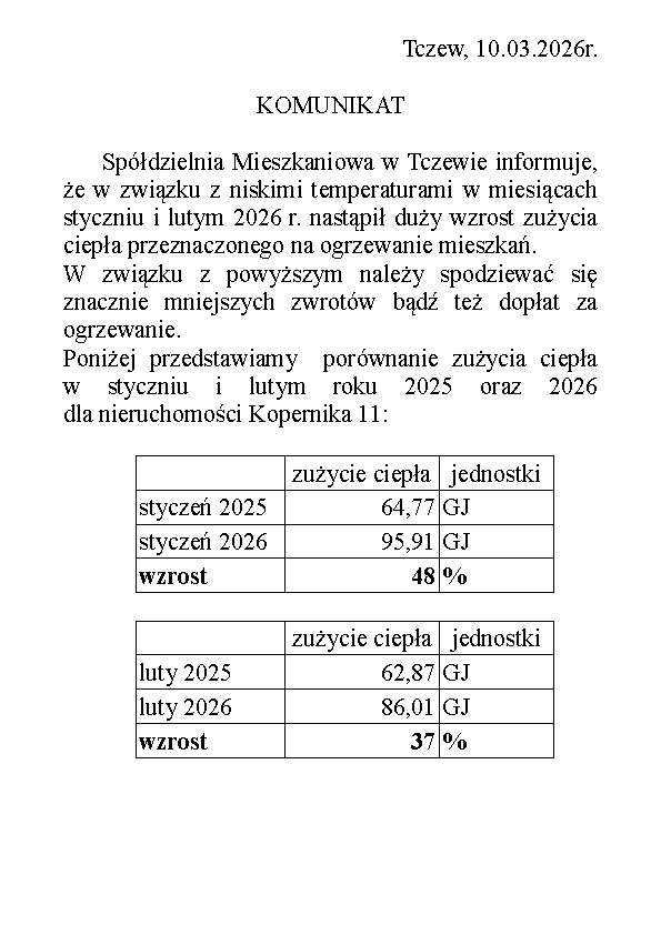W związku z niskimi temperaturami w miesiącach styczniu i lutym 2026 r. nastąpił znaczny wzrost zużycia ciepła przeznaczonego na ogrzewanie lokali. Prosimy zwrócić uwagę, że w rozliczeniu rocznym kosztów centralnego ogrzewania obejmującym te miesiące, należy spodziewać się znacznie mniejszych zwrotów bądź też dopłat za ogrzewanie.