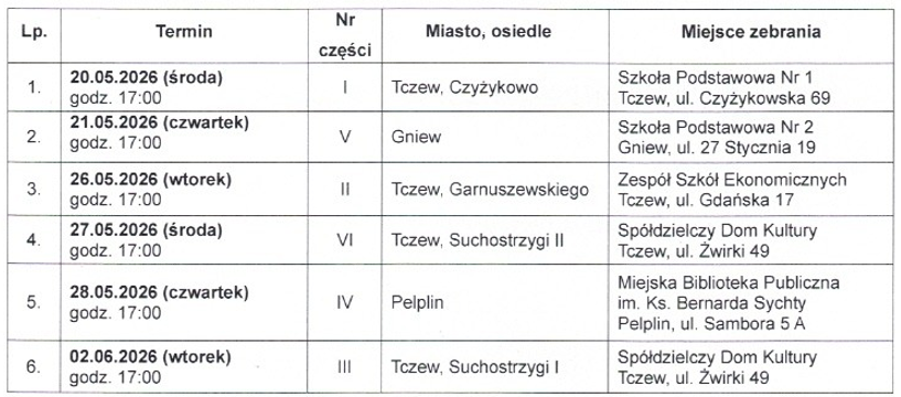 Zarząd Spółdzielni Mieszkaniowej w Tczewie zawiadamia zgodnie z § 138 Statutu, że zebrania poszczególnych części Walnego Zgromadzenia odbędą się zgodnie z poniższym harmonogramem: