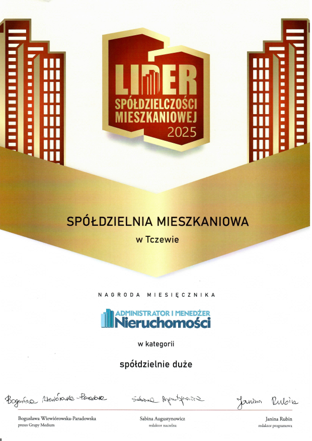 W 2016 r. Spółdzielnia Mieszkaniowa w Tczewie otrzymała nagrodę w I Ogólnopolskim Konkursie im. dr. Ryszarda Jajszczyka za osiągnięcia w prowadzonej działalności i propagowanie pozytywnego wizerunku spółdzielczości mieszkaniowej.